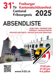 Tir Cantonal Fribourgeois 31e 2025 19-22 juin 27-30 juin 4-6 juillet www.fr25.ch ABSENDLISTE FUSIL F300 / GEWEHR G300 PISTOLET / PISTOLE P50/P25 PISTOLET SUR APPUI / PISTOLE AUFLAGE P50A/P25A Freiburger Tir Kantonalschützenfest Cantonal Fribourgeois e